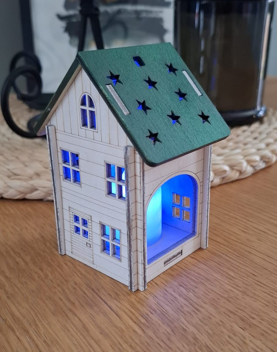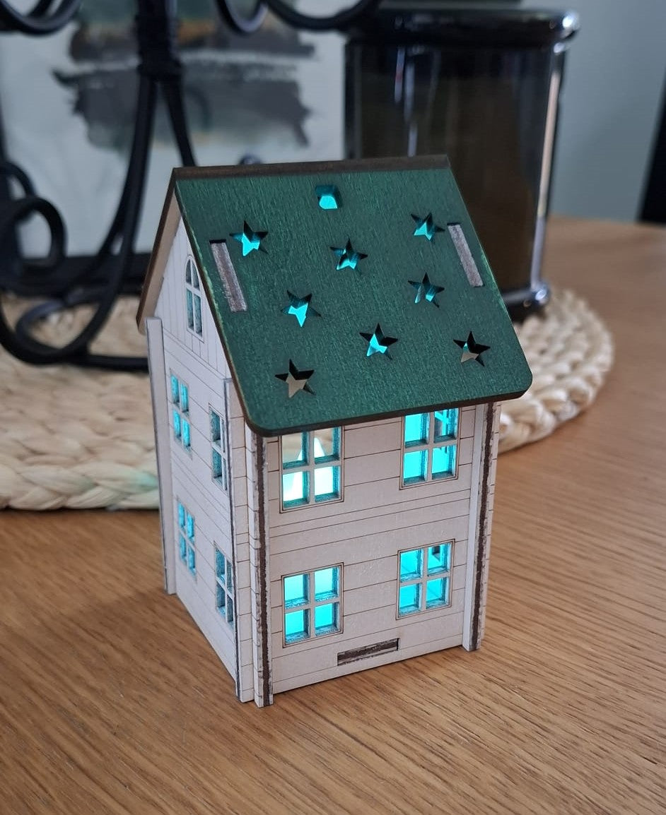 Roku darbs no koka ar rūpīgi izgrieztiem logiem un zvaigznītēm jumtā. Iekšpusē spīd droša, mākslīga svecīte, kas rada maigu gaismu un mājīgu svētku noskaņu.